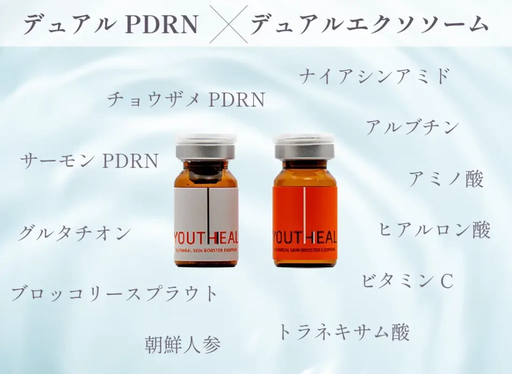 キャビア注射とは、韓国発のスキンブースター(薬剤名:ユースヒールYOUTHHEAL)です。チョウザメ・サーモンのDNAより抽出した2種類のPDRN、安全性の高い2種類の植物由来のエクソソーム(朝鮮人参、ブロッコリースプラウト)、美容の5大美白成分と言われる5種類の美白成分(グルタチオン、トラネキサム酸、ビタミンC、ナイアシンアミド、アルブチン)を主成分としたワンランク上のオールインワンスキンブースターです。