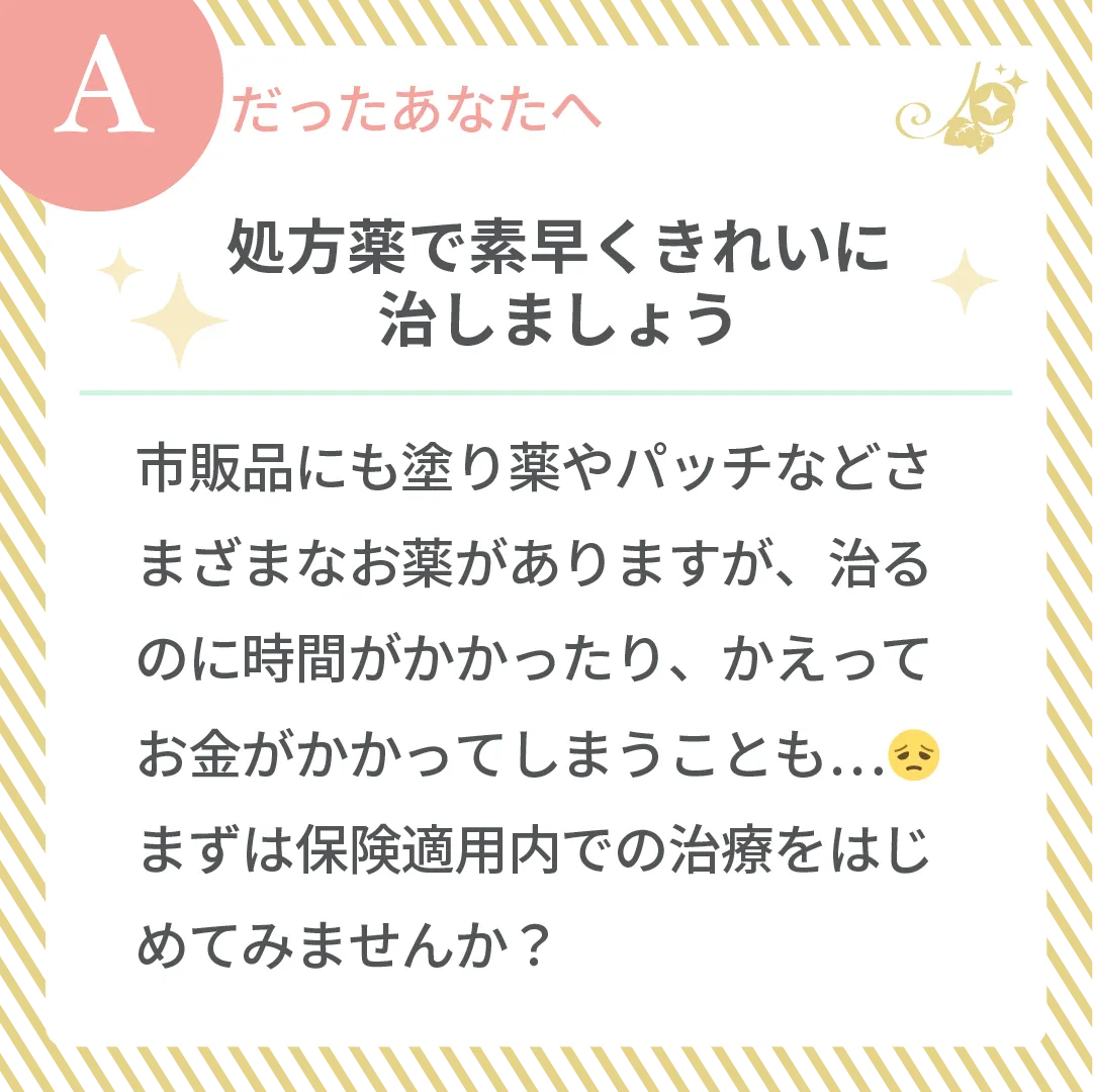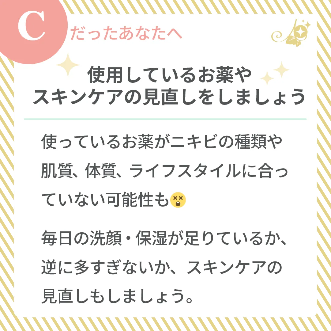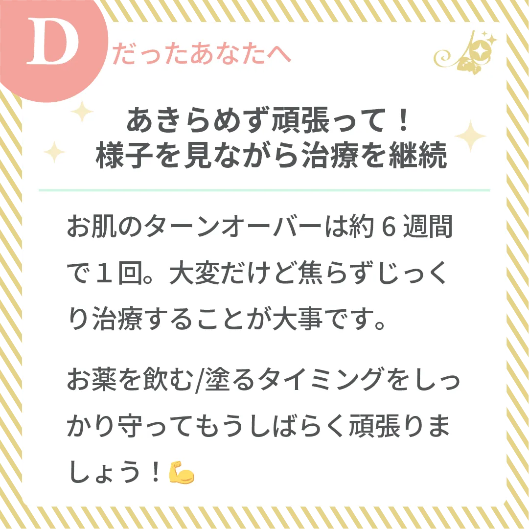 処方薬の使用を開始して3ヶ月未満のあなたへ処方薬やスキンケアの見直しをしてみましょう。まだ3ヶ月継続に満たない方は引き続き頑張りましょう!