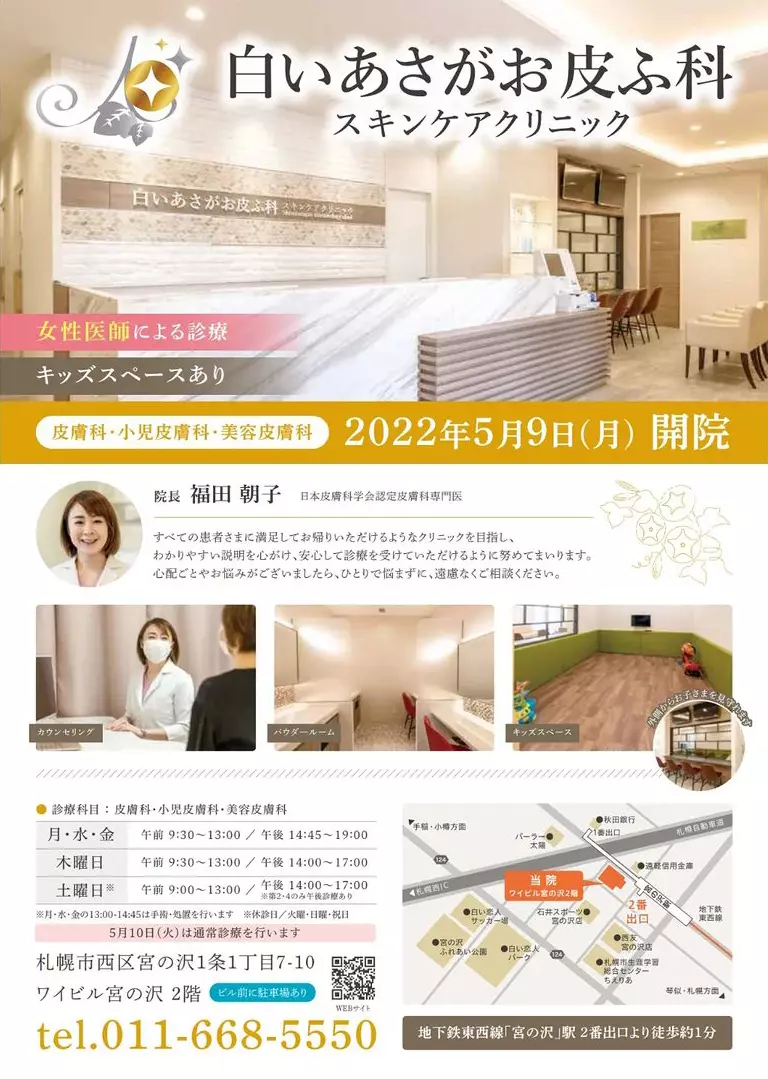 2022.3.22 Tue. 札幌・宮の沢に皮膚科スキンケアクリニックをオープンいたします 当院のホームページをご覧いただき、誠にありがとうございます。院長の福田朝子と申します。札幌市西区宮の沢にご縁をいただき、2022年5月2日に「白いあさがお皮ふ科スキンケアクリニック」を開業致します。 お子さまからご高齢の方まで、地域のみなさまのお肌の健康を守るお手伝いをさせていただきます。よろしくお願いいたします。
